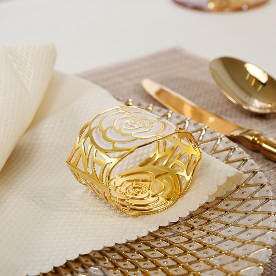 Unique hollow out rose design, shiny rose napkin ring can create a romantic atmosphere to wedding or bridal shower. Rose Design napkin rings will look graceful with many different linen colors and patterns,makes it versatile to use for formal and casual table settings(L58*W38mm    Height: 41mm     Thickness: 1.1mm    Net weight: 36g).