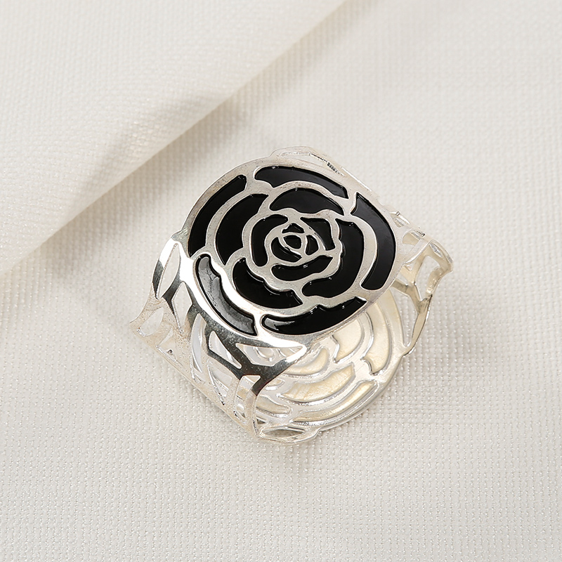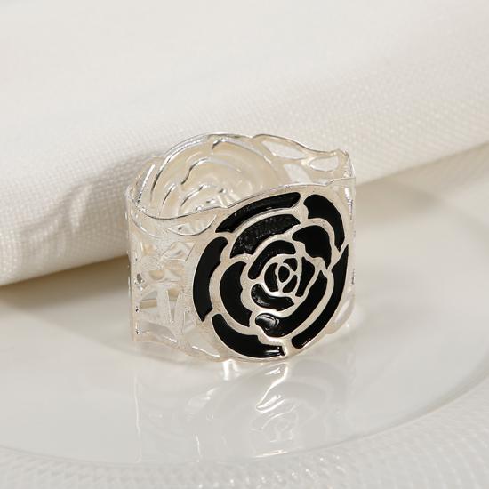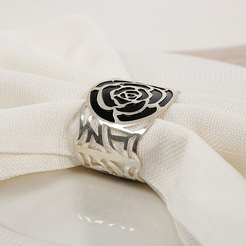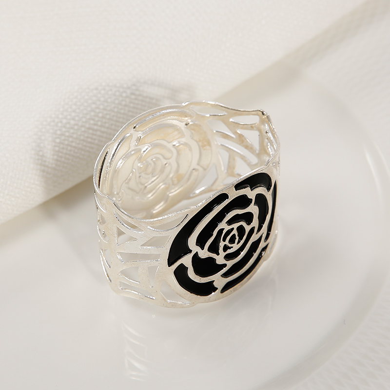 Black Rose Hollow-out Round Silvered Striking Alumimum Napkin Rings Set