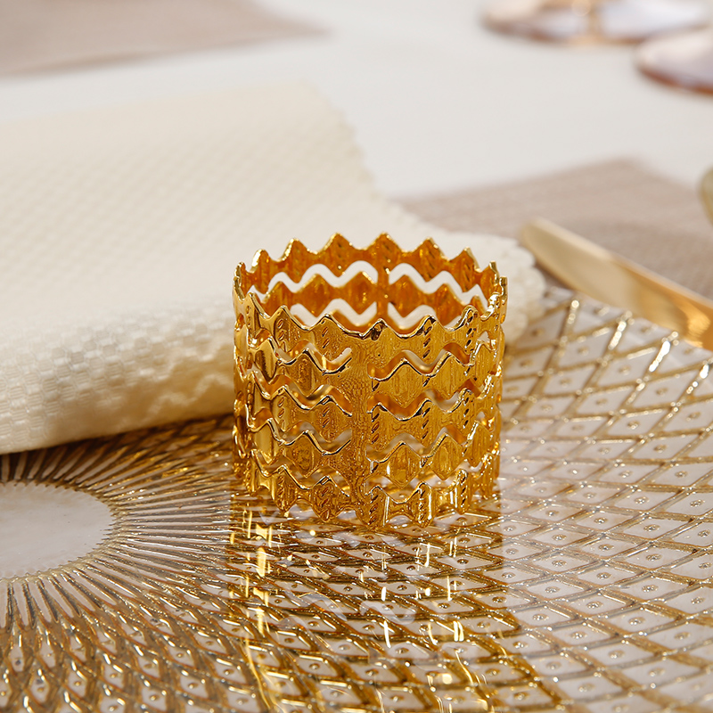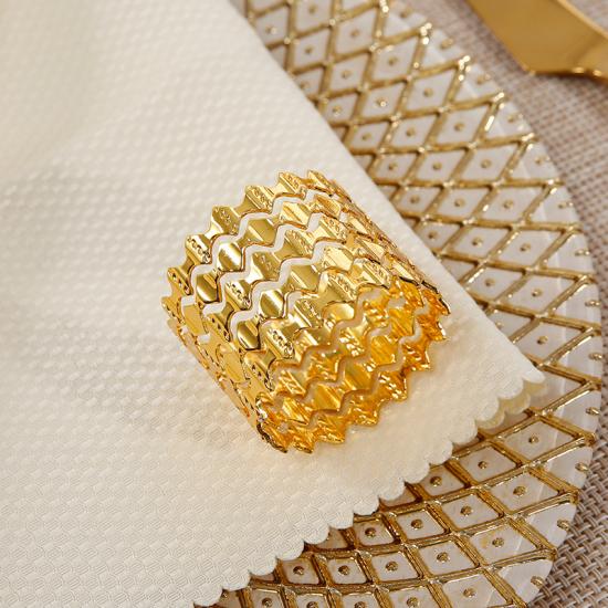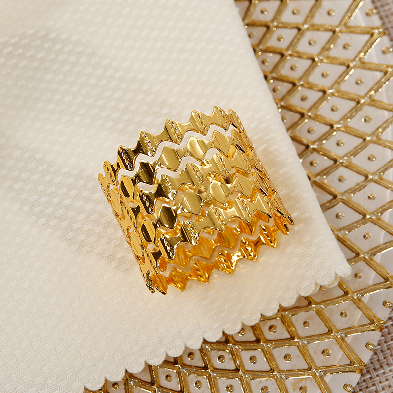 Sparkle your dining tables and startle your guests with these shimmering beauties. Our gold-plating round napkin rings accented with handcrafted hammered design are an ideal choice to add a hint of elegance and style to your dining tables. The seamless luster and impeccable sheen of metallic finish polish imparts a totally regal look and feel to these glimmering table decor. These unique design Napkin Rings can be paired with crisp white napkins for an elegant look, or with our sequin accented napkins, satin napkins, velvet napkins, and metallic foil paper napkins for your place settings and tablescapes.